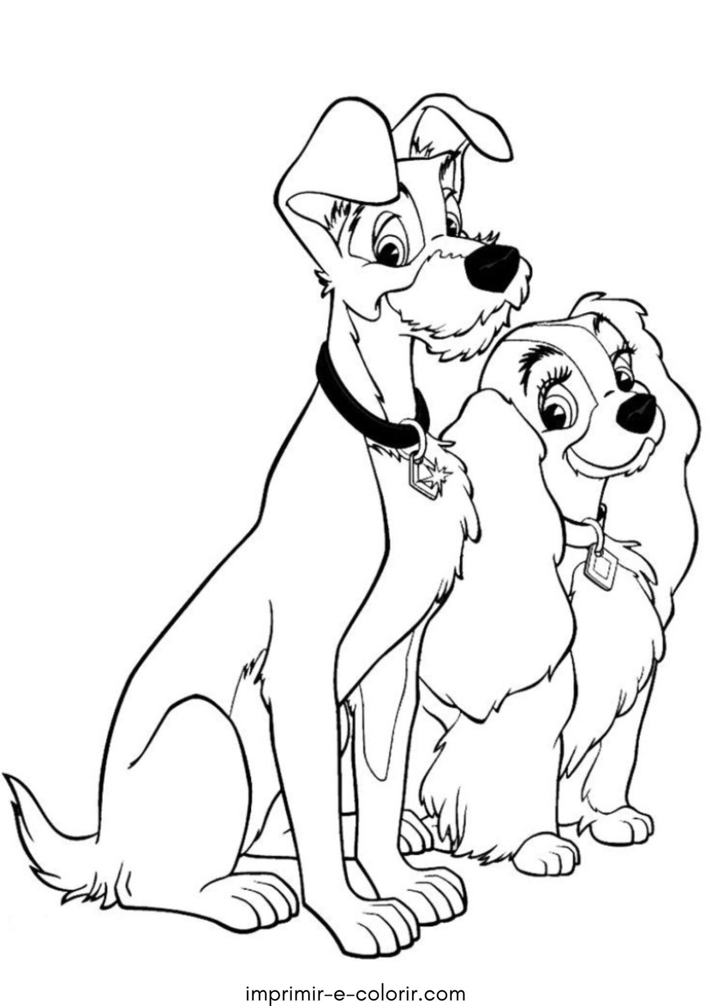 Para colorir, lápis de cor são ótimos para criar sombras suaves, enquanto canetinhas deixam tudo mais vibrante e tintas podem dar um toque especial 🎨. Você pode usar tons de bege e marrom claro para a Dama, marrom ou cinza para o Vagabundo, além de colorir as coleiras com azul ou vermelho. Um fundo em verde ou com cores suaves pode deixar a cena ainda mais bonita 🌿✨.
