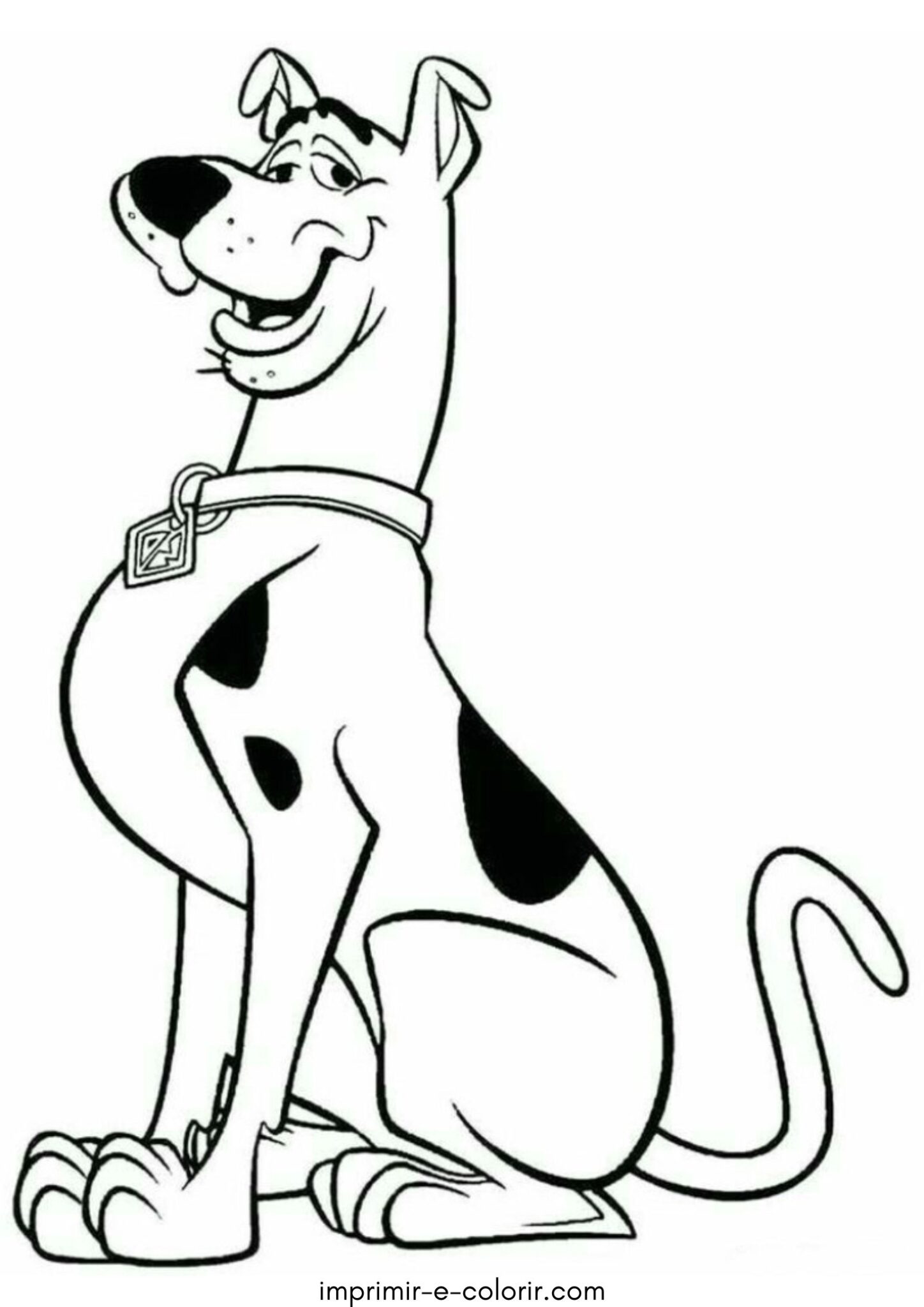 Nesta раскраска vemos o cachorro Scooby-Doo sentado, com um sorriso simpático e seu colar com medalha 🐶✨. O desenho é simples, com linhas bem marcadas e áreas grandes, sem muitos detalhes pequenos, o que facilita bastante para as crianças colorirem.