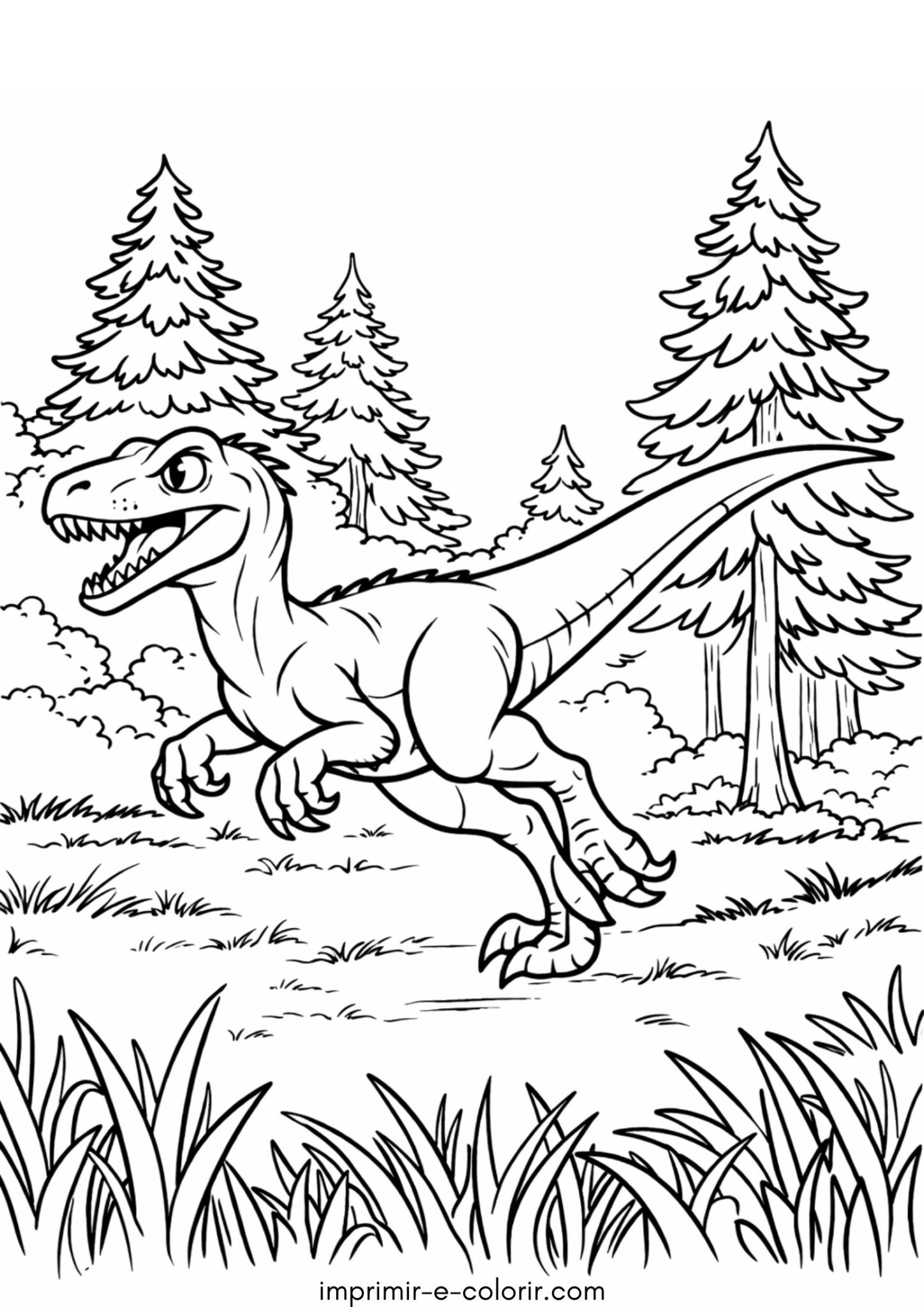 Este desenho para colorir mostra um dinossauro Velociraptor correndo rapidamente em meio à natureza, com árvores altas ao fundo e grama no primeiro plano 🌿🦖. A imagem tem traços claros e áreas bem definidas, sendo uma ilustração de nível médio, com alguns detalhes nas plantas e no corpo do динossauro, mas ainda fácil de pintar. É uma ótima opção tanto para meninos quanto para meninas que gostam de динossauros e aventuras, geralmente indicada para crianças a partir de 5 anos, mas também pode divertir adultos que gostam de relaxar colorindo.
