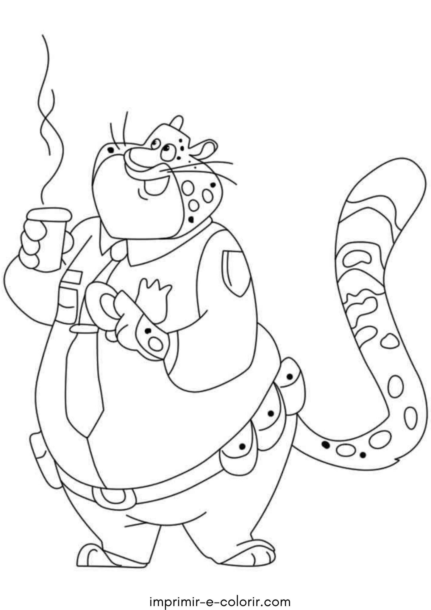 Neste desenho para colorir de Garraza, a criança pode ver um personagem simpático que é um guepardo, com seu corpo manchado característico e uma expressão calma, segurando uma xícara quente 😄🐆☕ Ele parece tranquilo, como se estivesse aproveitando um momento de descanso. O desenho é simples, com áreas grandes no corpo e na roupa, o que facilita a pintura, mas também tem alguns detalhes nas manchas e nos acessórios que deixam a atividade mais interessante 🎨