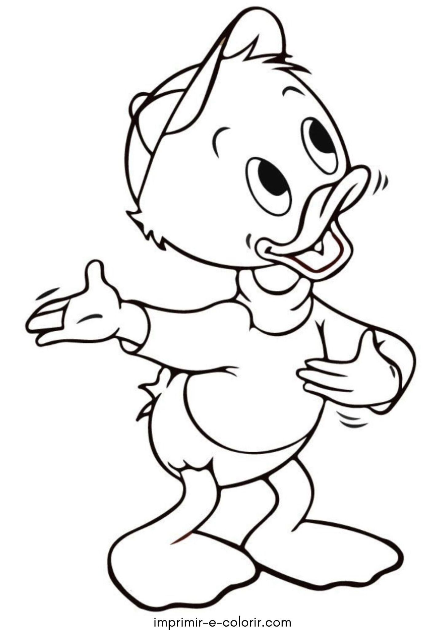 Nesta página de colorir vemos um dos sobrinhos do Pato Donald, Huguinho, Zezinho ou Luisinho, em uma pose alegre e animada 🦆✨. Ele está sorrindo, com o boné na cabeça e os braços abertos, como se estivesse conversando ou brincando. O desenho tem linhas bem definidas e áreas grandes, sendo simples e ótimo para crianças pequenas colorirem com facilidade.