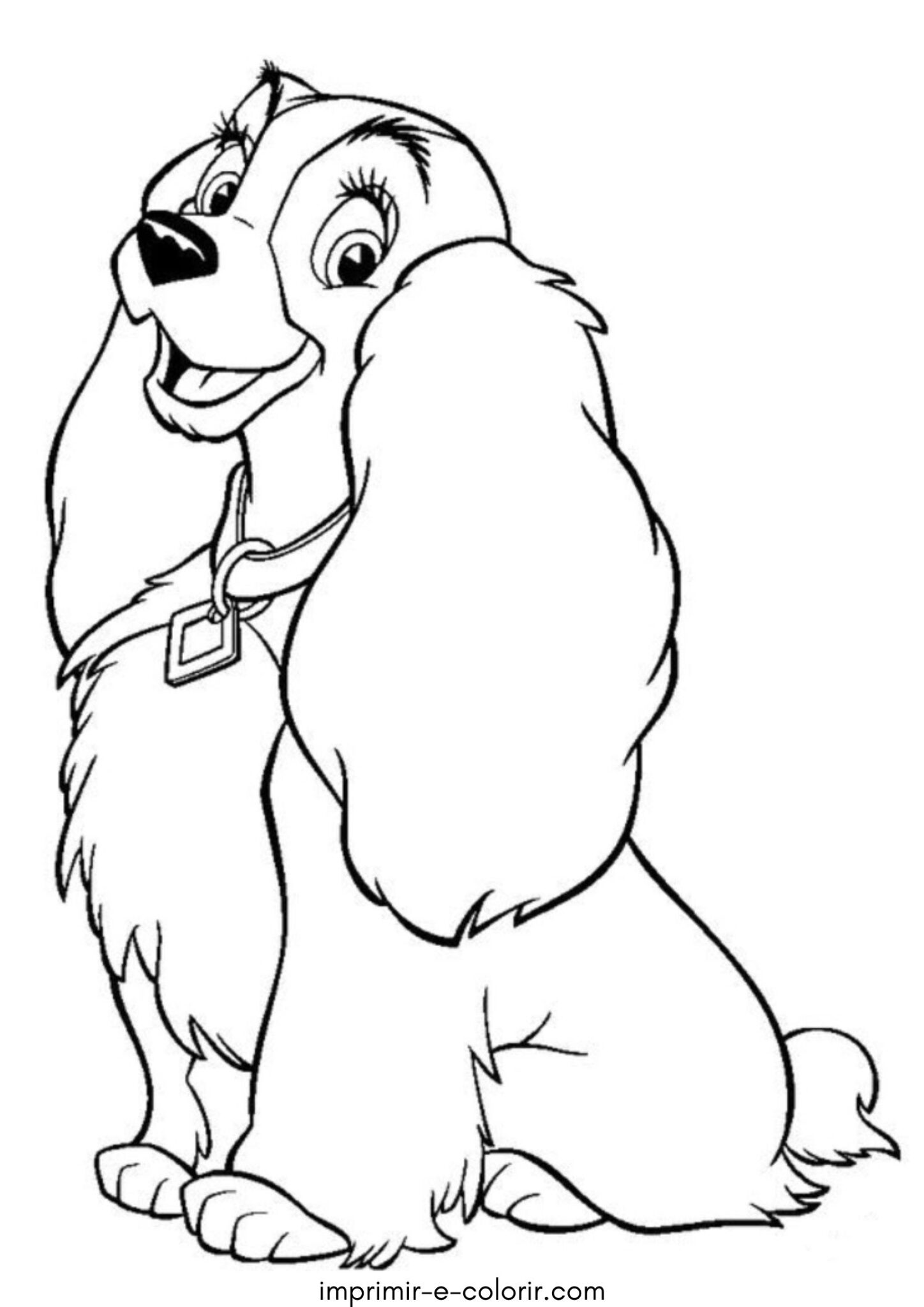 Nesta página de colorir vemos a Lady, a cachorrinha elegante de A Dama e o Vagabundo 🐶💖. Ela está sentada, com um sorriso doce, orelhas longas e bem peludas e sua coleira com pingente, mostrando todo o seu charme. O desenho tem linhas claras e áreas médias, não é muito simples nem muito detalhado, sendo confortável para colorir.