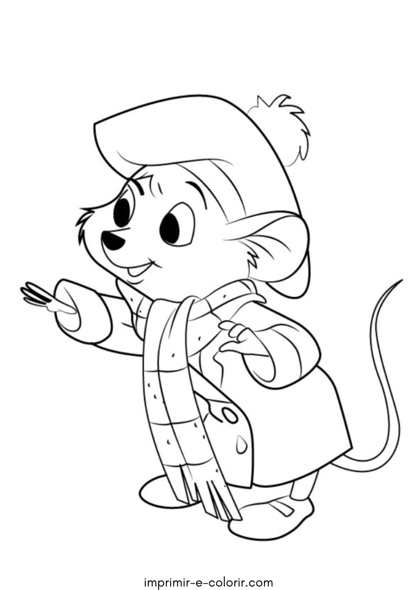 Nesta página de colorir vemos a pequena Olivia Flaversham, uma ratinha muito simpática vestida com casaco, cachecol e chapéu 🐭🧣. Ela está com uma expressão alegre e parece estar caminhando ou falando com alguém. O desenho é simples, com traços grandes e bem definidos, sem muitos detalhes pequenos, o que facilita bastante na hora de colorir.