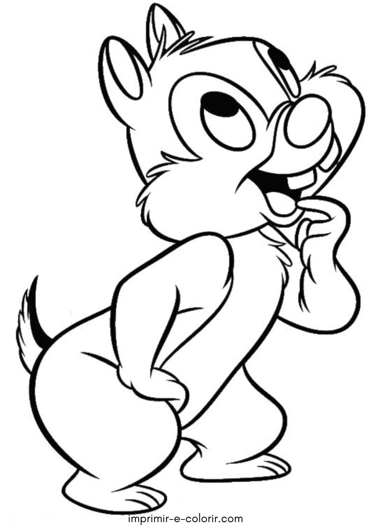 Nesta página de colorir vemos o Tico, o esquilinho simpático, olhando para cima com um sorriso esperto e curioso 🐿️✨. Ele está em pé, com as bochechas fofinhas e a cauda pequena, em uma pose divertida. O desenho tem traços bem marcados e áreas grandes, sendo simples e ótimo para crianças que estão começando a colorir.