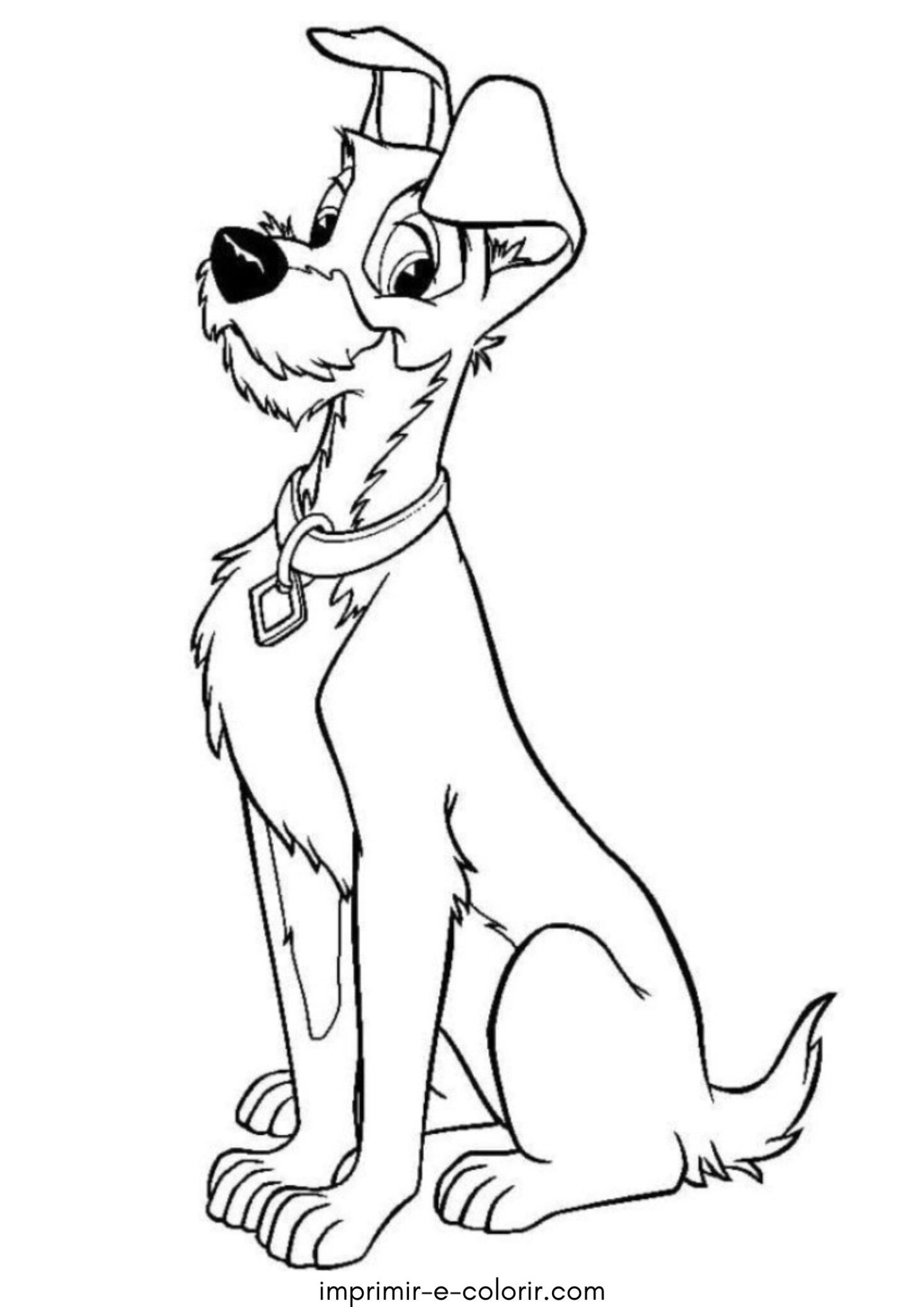 Nesta página de colorir vemos o Vagabundo sentado, com um olhar esperto e confiante 🐶✨. Ele tem orelhas levantadas, pelo um pouco bagunçado e uma coleira simples, mostrando seu jeito livre e simpático. O desenho tem traços bem definidos e áreas médias, não sendo muito simples nem muito detalhado, ideal para uma pintura tranquila.